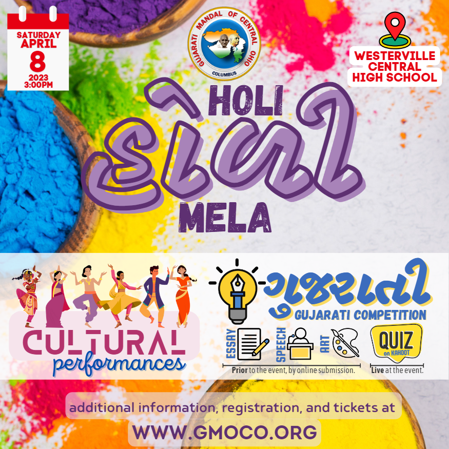 We are thrilled to announce the first event of the year! GMOCO Holi Mela 2023 will be held on Saturday, April 8 at the Westerville Central High School. Following our tradition, the event will include performances (dances and skits) that promote our culture, shopping booths from a variety of vendors, and mouth-watering eats.