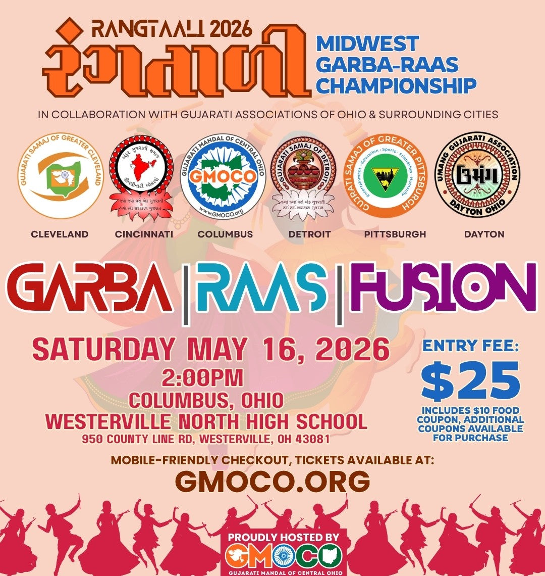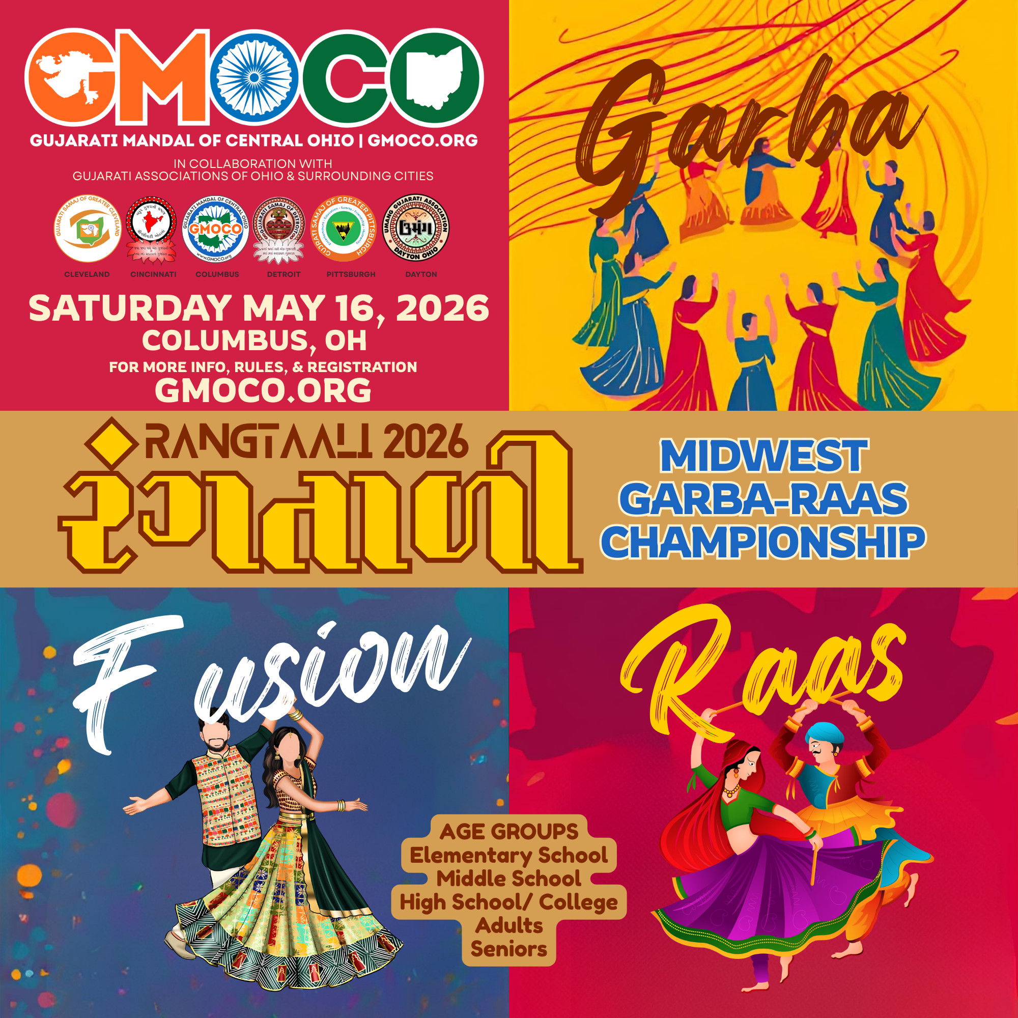 Hosted by Gujarati Mandal of Central Ohio, Rangtaali 2026 is a Garba-Raas championship showcase, bringing together some of the most talented performers from across the Midwest.